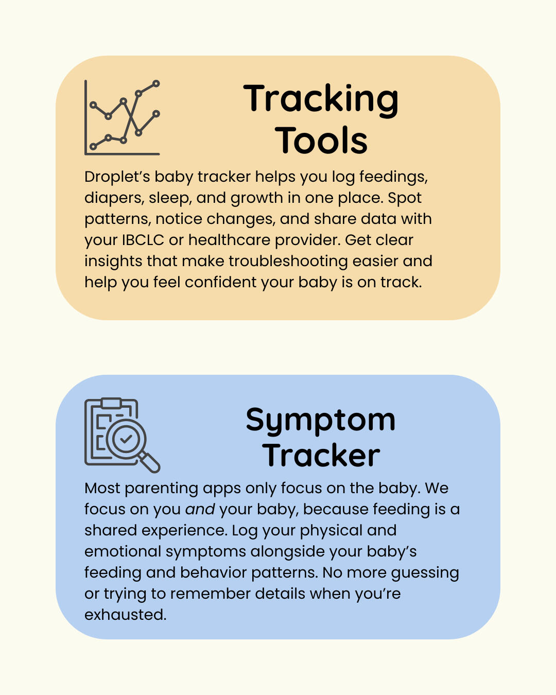 It's impossible to teach you everything you need to know about lactation in one prenatal class or a lactation consult while you're recovering from childbirth. The reality is, most of your time and energy will go into feeding as a new parent. Droplet gives you the ongoing support you need as you and your baby learn together.