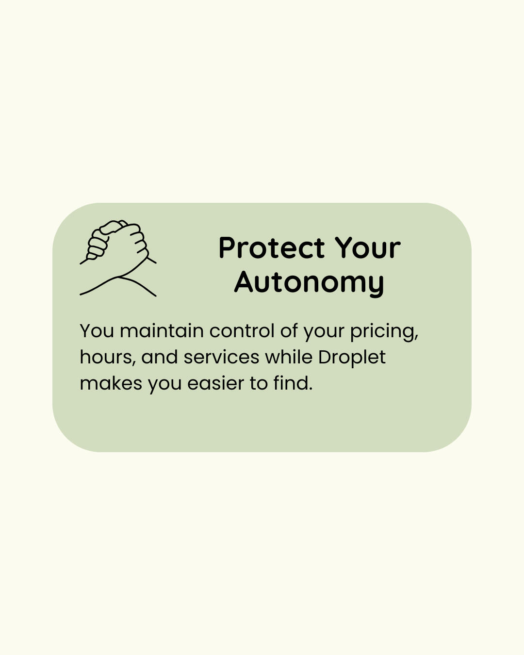 --Notify us immediately of any unauthorized use of your account or any other security breach.10. Limitation of LiabilityYou agree to indemnify and hold harmless the Company, its affiliates, and their respective officers, directors, employees, and agents from and against any and all claims, liabilities, damages, losses, costs, expenses, or fees arising from or relating to your use of the App in violation of these Terms or any applicable laws or regulations.11. TerminationWe reserve the right, at our sole discretion, to suspend or terminate your access to the App at any time, with or without cause, and without prior notice, including but not limited to, a violation of these Terms.12. Governing LawThese Terms shall be governed by and construed in accordance with the laws of the State of California without regard to its conflict of law provisions.By registering as a provider on Droplet, you confirm that you have read, understood, and agree to this Provider Terms Addendum.